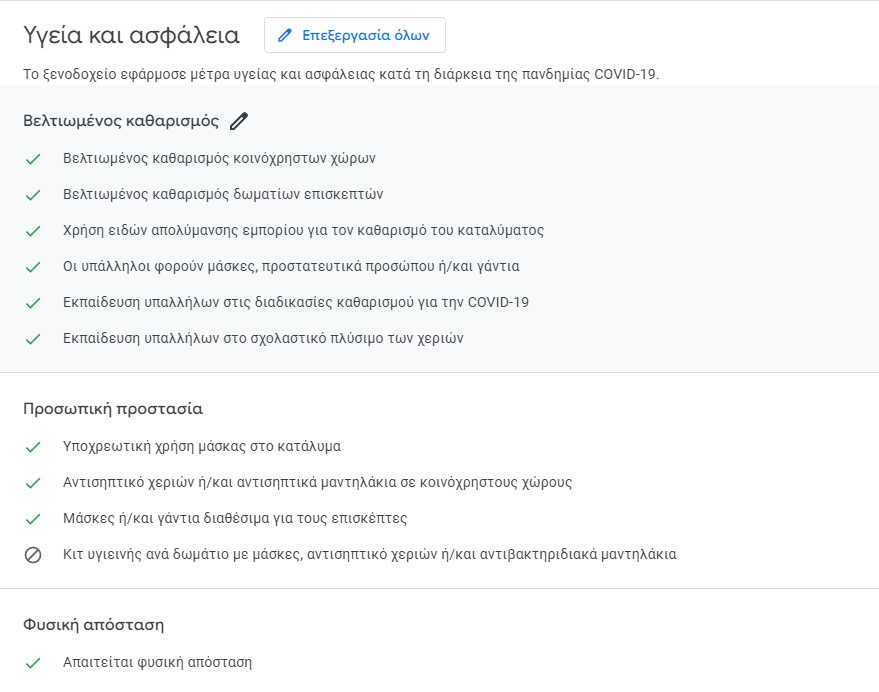 Αυτά τα χαρακτηριστικά είναι ιδιαίτερα σημαντικά μετά την πανδημία, προσφέροντας σιγουριά στους πελάτες ότι η επιχείρησή σας είναι ασφαλής. Όλα τα χαρακτηριστικά δεν είναι διαθέσιμα για όλες τις επιχειρήσεις. Εδώ π.χ. είναι διαθέσιμο αυτή τη στιγμή για ξενοδοχεία αλλά όχι για επιχειρήσεις εστίασης. Κοινά χαρακτηριστικά υγείας και ασφάλειας περιλαμβάνουν: